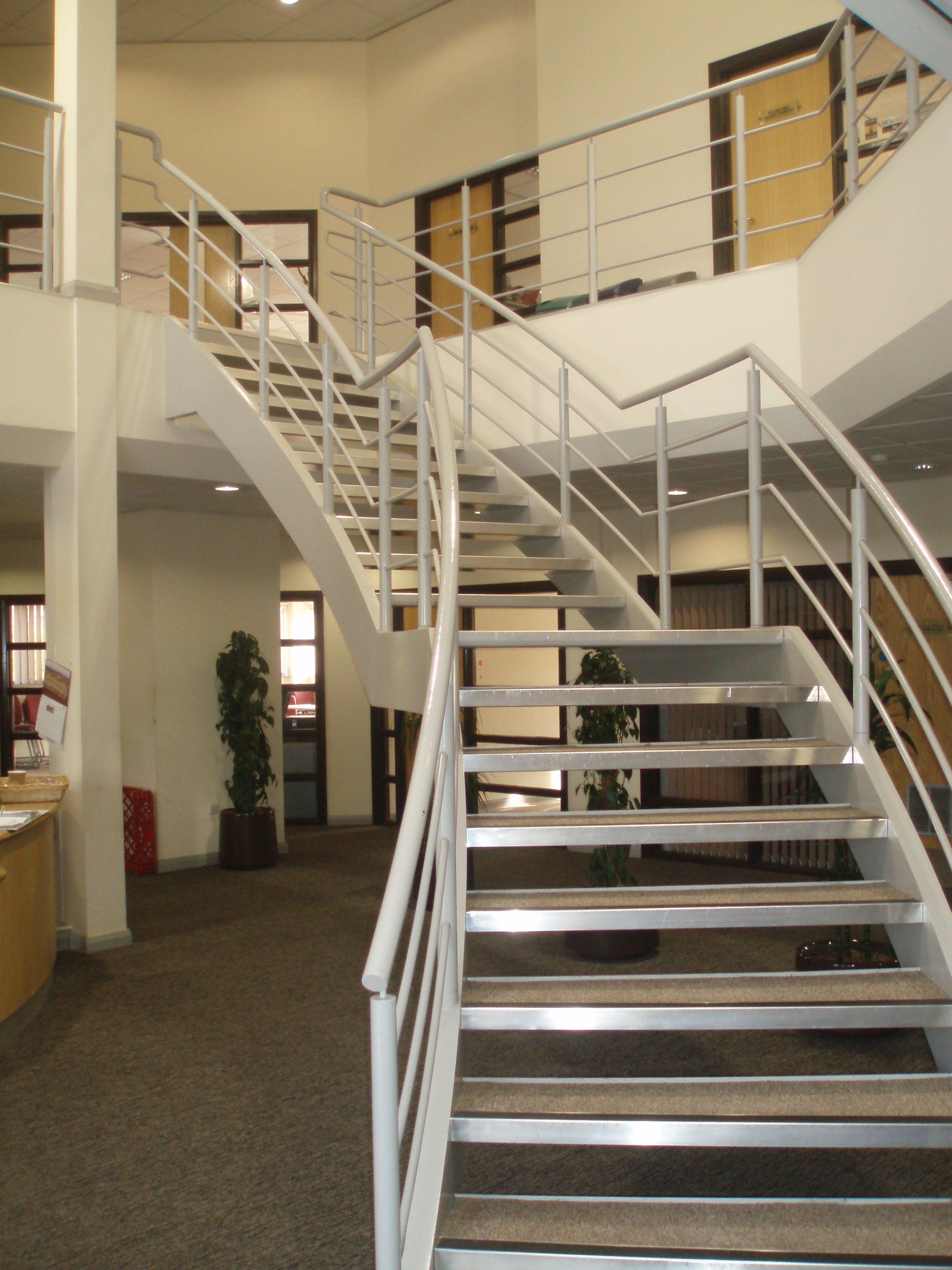 Our design and the completed building comprises offices on two floors wrapped around a glazed atrium with a curving feature stair. Each office door includes a glazed side screen as a way of ensuring visual links between office occupants and those using the circulation spaces and shared rest room and break out areas are used to encourage conversations between building users.